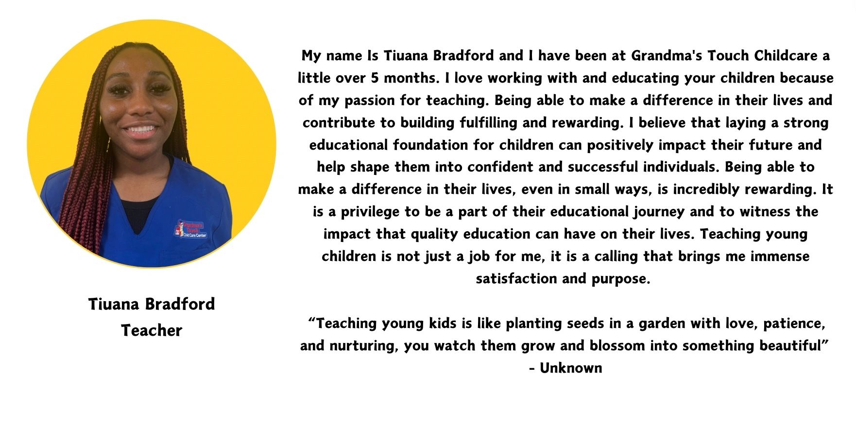 Grandma’s Touch Childcare is always looking for energetic and passionate teachers to join our family. Our staff helps foster an empowering learning environment to enhance childhood development. Please get in contact with us if you are inspired by coming to work each day knowing your actions has a positive impact on your community and the next generation of future leaders.