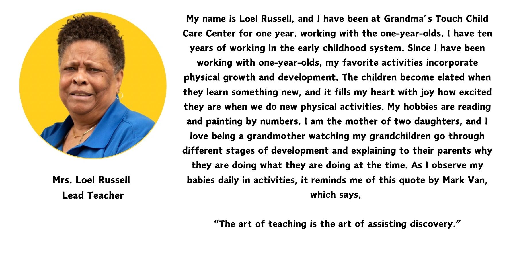 Grandma’s Touch Childcare follows the state’s guidelines for the teacher-to-student ratio.